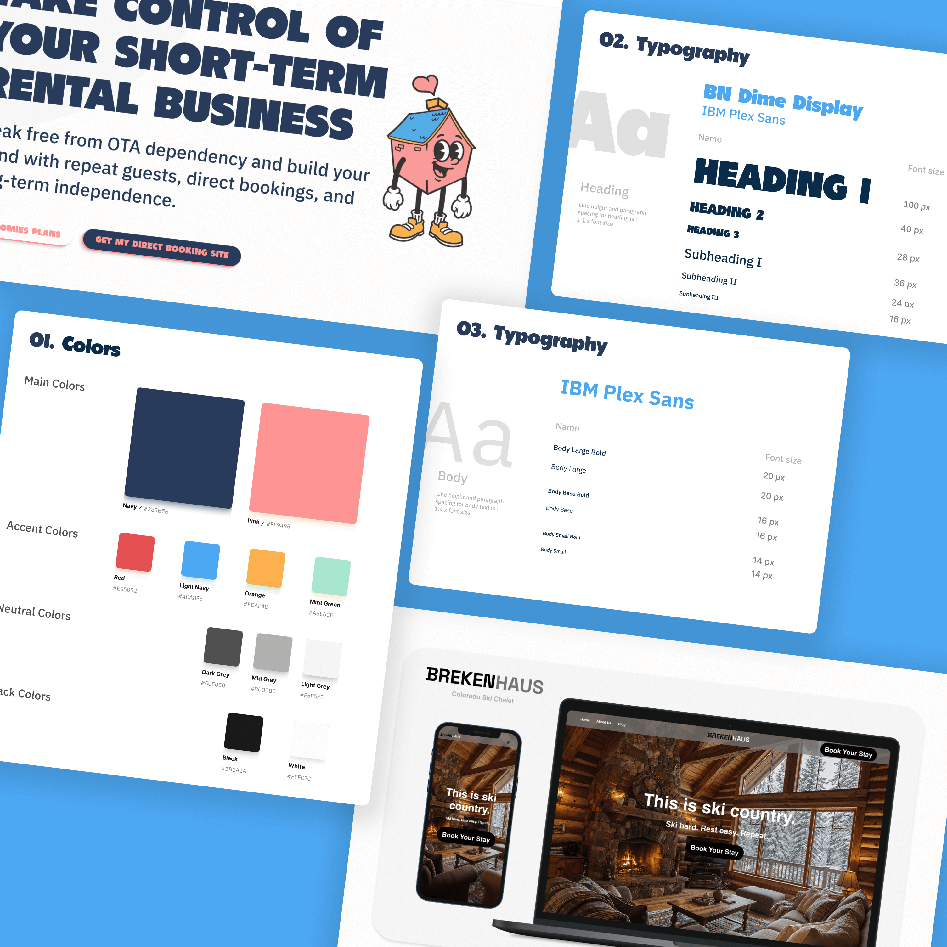 Typography: Selected BN Dime Display for playful, strong headlines on marketing materials, supported by IBM Plex Sans for optimal content readability across marketing storytelling and data-heavy dashboard interfaces. For client sites, custom headline fonts paired with IBM Plex Sans create property-specific personality while maintaining system consistency and readability.