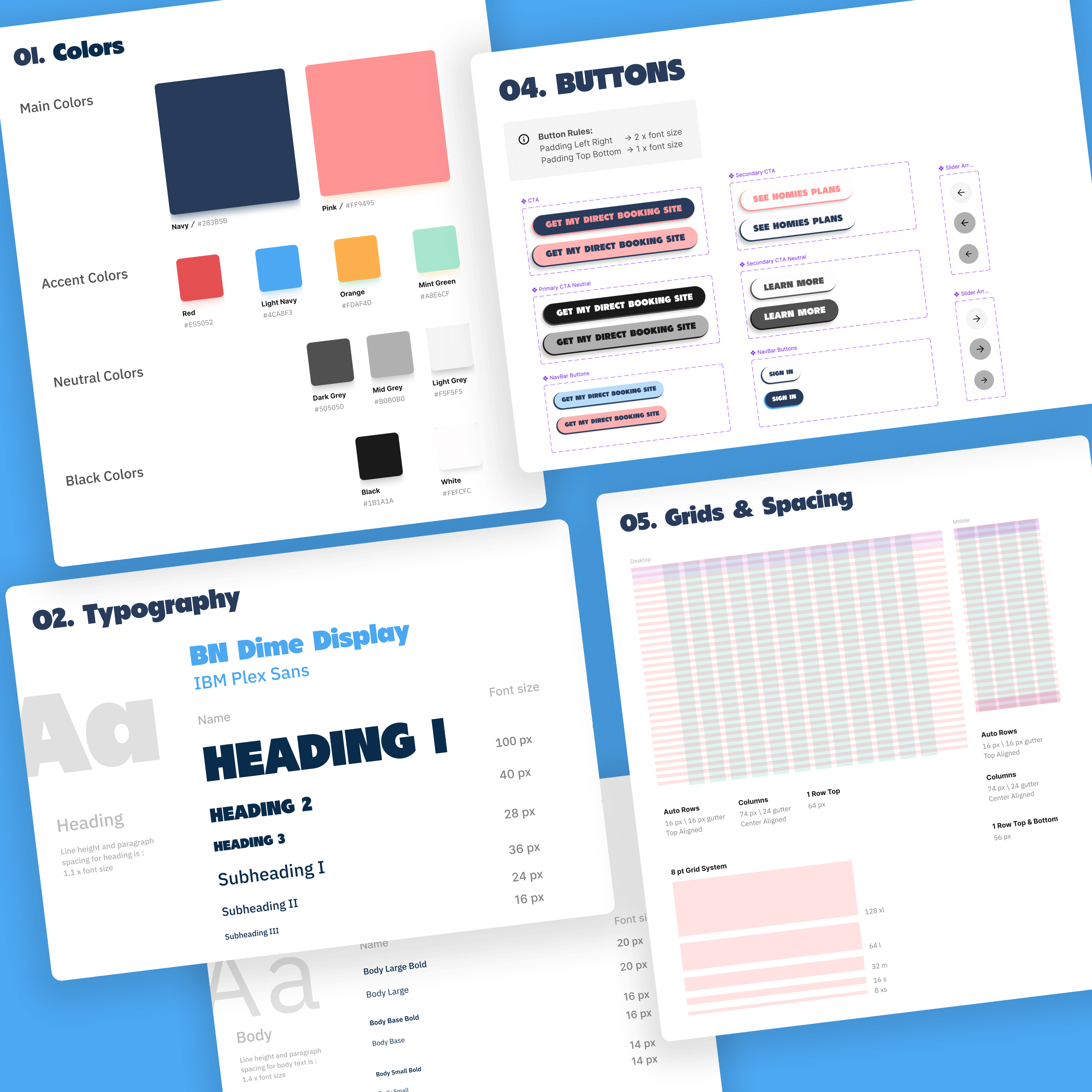 Applied consistent typography hierarchy (IBM Plex Sans system) and grid structure across Homies platform and client booking sites